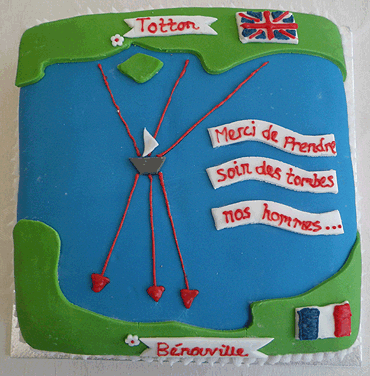 A cake made by Christina, owner of the Cafe Bon Appetit, in Totton Southampton, which will travel over to Pegasus Bridge in France, on board MGB 81, in time for the 70th DDay commemorations. It will be given to the Mayor of Benouville, the small village at Pegasus Bridge. It is intended as a thank you to the folk of the region, for looking after the many graves of our fallen. |