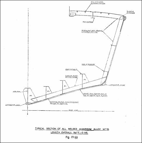 It was decided by the Director of Naval Construction that the basic load bearing structure should consist in welded aluminium, the bottom and sides would be of double diagonal mahogany planking. The planking is fastened to the aluminium by stainless steel bolts. (See Fig. 19 (a), (b) and (c).)
