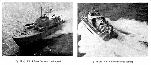 Manoeuvrability, which includes turning circles, is quite exceptional. This is largely due to the relatively powerful electro-hydraulic steering gear developed, which can be put over to 25° in 3 seconds. Whereas the “Staff requirement” called for a turning circle diameter not more than 8 lengths at full speed, the Brave Borderer achieved a turning circle diameter of 4 lengths at 50 knots. (See Fig. 21 (a) and (b).)