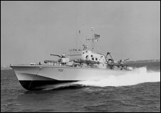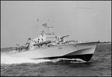 Close throttles and engage neutral. When speed is reduced to 15 knots engage astern open to 3,000 p.t.r.p.m. until astern way on then stop. Note that only 15 sees, was required from 50 knots ahead to engines running astern! Turning trials were carried out at full speed applying helm angles up to 25° either way resulting in a turning circle diameter of 4.5 boat lengths. This was associated with maximum yawing velocity of 25°/sec.