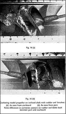 Analysis of these results enabled the optimum propeller to be designed and we have subsequently confirmed the break¬down of this overall propulsive coefficient as a result of an interesting and realistic experiment in our cavitation tunnel where the shaft has been inclined to 130 to the tunnel axis, and is held by a propeller bracket with a rudder realistically placed in the slipstream. We have been able to gain an insight into the various factors involved, as we are able to measure the axial thrust and torque, also the forces acting on the propeller bracket and rudder. A study of the cavitation pattern shows marked difference between one side of the propeller and the other, the chief difference occurring at 3 o’clock and 9 o’clock. (See Figs. 16 (a), (b) and 17.)