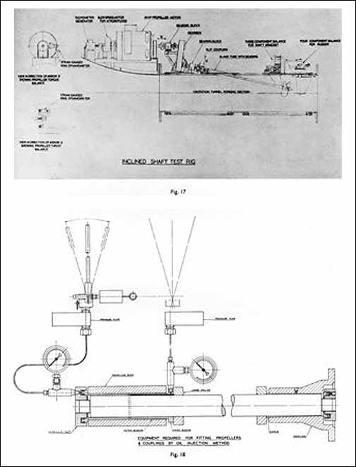 This allows of a half-inch reduction in the diameter of shafting, which assists the general problem of appendage drag reduction. Though the diameter is reduced we are not helped over the matter of critical whirling speeds to meet the problem of which we have to incorporate an intermediate shaft bracket. (See Fig. 18.) |