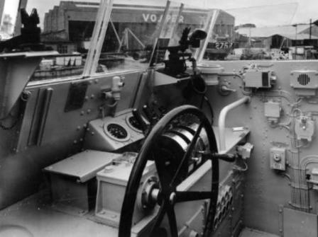 The bridge of a Vosper built craft that has not been positively identified. There were four Vosper built craft and it could be one of any. Those built by Vosper were P1108 Dark Buccaneer (32.6.'54), P1109 Dark Clipper (9.2.'55) P1110 Dark Highwayman, (29.3.'55) P1107 Dark Rover, (30.8.'54). There were 3 Dark class vessels cancelled in 1955. Dark Chaser, Dark Chieftan and Dark Crusader. (Photo courtesy of Ted Else)