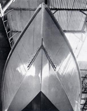 The bow of an all Aluminium 'Dark' showing the flush riveting etc