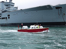 Farewell to the aircraft carrier Ark Royal, under tow, as she departs from Portsmouth on Monday the 20th May 2013. She is on her way to a Turkish scrapyard. She was seen off by the PNBPT 25ft FMB Ark Royal, which served on board the Ark Royal, previous to this one. The FMB has a new propeller, and reaches a very handsome 15 knots at 2500 rpm with her new Perkins