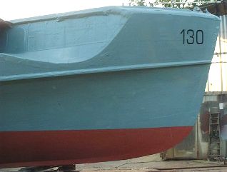 S130 was slipped on the 2/9/04 at the Hythe Marine slipway, here in Hythe which is about 2 miles from Marchwood, Southampton. I had previously found the sea cocks open, which explained a lot of water in the hull, but even with those closed, she took water. On examination of the underwater hull, it was found that a previous damage amidships, close to the keel on the starboard side, had been very lightly covered over.