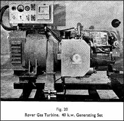 The first item for consideration was the generating plant, which, after consideration of a number of alternatives, eventually consisted of two units based on the Rover gas turbine combined with a generator developed by Metropolitan Vickers Ltd. These little units (Fig. 20) have given excellent service up to date. The only difficulty in service has arisen through the accidental ingestion of an oil spray from a neighbouring gearbox which caused instability.