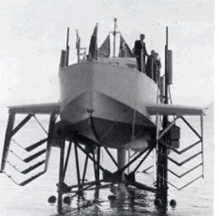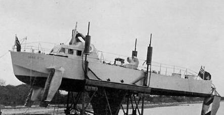 Below are 3 pictures of HMCN Bras d'Or, an experimental craft commisioned by the Royal Canadian Navy but has, as can be seen from her hull lines, an obvious lineage from the Admiralty Type A craft known as the 'Dark' class. She was launched by Mrs Hartley Zimmerman, wife of the Chairman of the Defence Research Board of Canada and apart from the obvious hyrdofoil attachments, she was powered by two Rolls Royce Marine 'Griffon' engines. (Courtesy of Ted Else)
