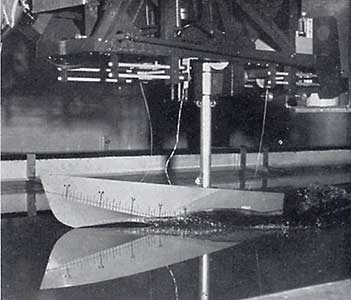 An early photo (above) of the final hull lines of the type "A" under test at the Admiralty test tank. This image is thought to have been taken very late '40s or early 1950. (Photo courtesy of Ted Else via Dave Abbot)