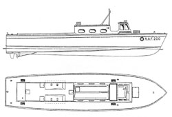 The early craft of the 200 series were powered by twin Power Meadows petrol engines, which were produced for the British Power Boat Company by the Meadows Company of Wolverhampton. Each had a rating of 100hp and through Meadows gearboxes directly drove the 14" manganese bronze propellers. Maximum speed was about 29 knots which could be maintained for ½ an hour. Otherwise the maximum cruising speed was 24 knots and with the 65 gallons of fuel carried, gave an endurance of 140 miles. Later units of the 200 series seaplane tenders (craft numbered 292-303 and 323-324) were powered by twin Perkins S6M diesel engines. Several of the type, like ST 206, were subsequently converted to Firefloats. |
