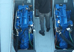 General housekeeping was carried out, and she is now back in the water, awaiting the engines to settle into the hull, and these can then be aligned, secured and connected to the shafts. Trials will follow.